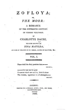 - ↑ "Rosa Matilda's Romance. This Day is published, ZOFLOYA; or, The MOOR: a Romance of the Fifteenth Century, in three volumes. By Charlotte Dacre (Better known as ROSA MATILDA) Author of the Nun of St. Omer's, Hours of Solitude, &c. Printed for Longman, Hurst, Rees and Orme, Paternoster-row". Morning Post. 15 May 1806. p. 2.
