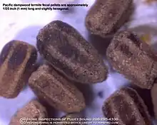 An important sign to identifying dampwood termite infestations is their unique fecal pellets. They are approximately 1 mm in length and slightly hexagonal.[1]