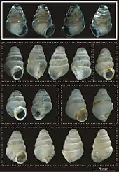 Zospeum tholussum was formally described by the German taxonomist Alexander M. Weigand in 2013, based on the specimens the caving expedition recovered. The specific name is derived from Latin tholus, meaning dome or cupola, referring to the distinctive dome-like shape of the second whorl of the shell. The nine type specimens are currently deposited in the Forschungsinstitut und Naturmuseum Senckenberg in Frankfurt am Main, Germany (museum voucher SMF 341633). The eight empty shells were used as the paratypes by Weigand, one of which was broken open to investigate the central column of the shell, while the single living specimen was designated as the holotype.[5] Zospeum tholussum is classified under the genus Zospeum of the subfamily Carychiinae in the hollow-shelled snail family, Ellobiidae.[13] Although some authors (including Weigand) consider Carychiinae to be a separate family, Carychiidae.[14]
