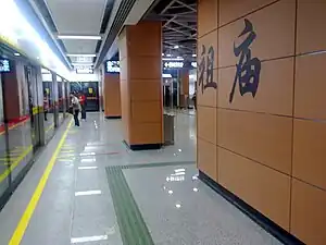 Zumiao Station (Chinese: 祖庙站; lit. 'Ancestral Temple Station'), is a metro station on Guangfo Line (FMetro Line 1), which will be the future interchange station between Guangfo Line (FMetro Line 1) and FMetro Line 5.[1][2] It is located under Jianxin Road (建新路) east of its junction with Zumiao Road (祖庙路) in the Chancheng District of Foshan, near the Foshan Ancestral Temple.[3] The station lies in the central business district of Foshan old city[4] and was completed on 3 November 2010.