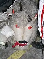 The standard Zvončar costume includes white trousers, striped shirt, and a sheepskin throw. In their hands they hold a "balta" or "bačuka" — a stylized mace, and around the waist one or more big brass bells. The costume varies from village to village; for example, Zvončari of Halubje and Grobnik (Dondolaši) wear special stylized masks representing fantastic animal heads, while Zvončari of Žejane (populated by Istro-Romanians) and Brgud wear "flower hats". Local legend claims that it was the Zvončari that scared away invading Tatars or Turks during the Ottoman conquest, with shepherds doning masks on their heads, along with belted-on bells, produced a deafening noise that scared the enemy away. From that time on, a mace became part of the standard equipment of Zvončari.[2]