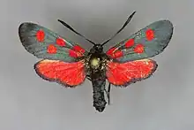 Zygaena angelicae (slender Scotch burnet)[1] is a species of moth in the Zygaenidae family. It is found in Central Europe, from Greece to southern Germany and Thuringia.[2] Z.angelicae has blue-black or green-black forewings, whose inner angles are strongly rounded off. On the forewings there are five or six red spots, two of which are always close together. In the five-spotted individuals, the spots on the underside of the wings are connected by a red stripe, in the six-spotted ones this is a large patch. The black margin of the red hind wings is wide. The antennal club is white at the tip less so than in Zygaena transalpina and the white may be completely absent. The wingspan is 30–33 mm.
