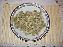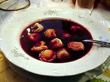 - vushka (A dish of small dumplings, typically filled with mushrooms and/or meat and served with borscht. When vegetarian (filled only with mushrooms or onion), they are a part of traditional Christmas Eve dinner.)