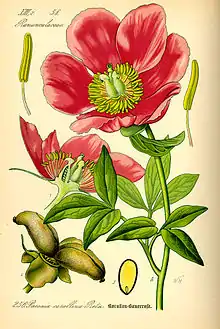Ultimately from Ancient Greek Παιονία (Paionía, a place name in Macedon).