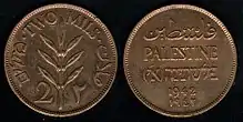 From a coin used in the time of British Mandatory Palestine, in which a tree was depicted on the obverse, and the words PALESTINE and פלשתינה on the reverse.