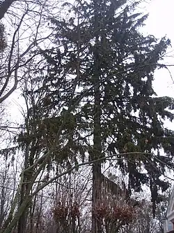 Unknown origin; due to the date of its record appearance, it seems less likely to be from German Tannenbaum, although it may play a factor in its later association with Christmas. The connection to Hittite 𒄑𒋫𒈾𒀀𒌑 (GIŠta-na-a-ú /tanau/, “fir”) also is a challenge due to the lack of intermediaries; for more see Tanne. Perhaps there is a connection to ن ي ب (n-y-b) in نَاب (nāb) dealing with sharp points, with Semitic glosses like “fang, tusk, pincer, honeybee, stingers, shaped like a long tooth”. This could be a reference to either the sharp and pointed pine needles, or even the general pointed cone shape of the tree.