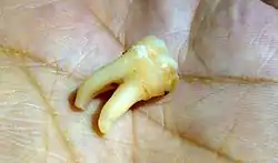 Borrowed from Classical Persian دندان (dandān). Doublet of دانت (dā̃t).