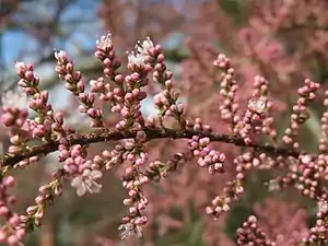 From Middle Persian from which Persian گزمازه (gazmâza), being گز (gaz, “tamarisk”) + مازه (mâza, “spine”), so called because of the spiral or spinal way the fruits grow around the branch.