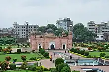 Borrowed from Urdu ڈھاکہ, which is from Bengali ঢাকা (ḍhaka).