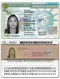 گرین کارت • (gerin kârt) (plural گرین کارتها (gerin kârt-hâ))