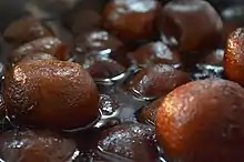 Chashni Syrup served alongside solid milk balls in the Indian dish Gulab Jamun.