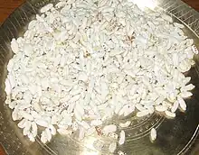 Inherited from Sanskrit আক্ষত (ākṣata, “unhurt”). Cognate with Bengali খই (khoi), Kumaoni आँँखत (“rice soaked in water”), Gujarati આખું (ākhũ, “whole, uncastrated”), આખી (ākhī, “ceremony of carrying rice or corn in the hand round a person to remove the effects of the evil eye”), Marathi आखा (ākhā, “whole, undivided”), Konkani आखो (ākho, “complete”).