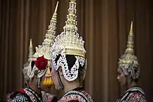 1. (พระ~) a type of elegant headwear with a long top, traditionally worn by deities, royalty, and performers of certain plays.