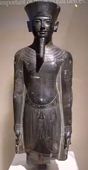 From Demotic mn (“statue of a god”), from Egyptian mnw (“monument, statue”).