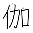 伽 (Kangxi radical 9, 人+5, 7 strokes, cangjie input 人大尸口 (OKSR), four-corner 26200, composition ⿰亻加)