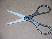 - scissors; (specifically) scissors with two crossed blades, each ending in a loop; western-style scissors