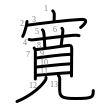 寛 (Kangxi radical 40, 宀+10, 13 strokes, cangjie input 十廿月山 (JTBU), four-corner 30212, composition ⿱宀莧)