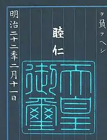 Compound of 御名 (gyomei, “name of the Emperor; the Imperial Signature”) + 御璽 (gyoji, “the Imperial Seal”).