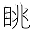 眺 (Kangxi radical 109, 目+6, 11 strokes, cangjie input 月山中一人 (BULMO), four-corner 62013, composition ⿰目兆)