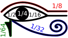 (𓂀), and specifically the forward-facing part of the white of the eye. In Egyptian mythology, the eye was torn out and dismembered by Set, and subsequently pieced back together and restored by Thoth. The series of Egyptian fractional measures of grain would then be either directly based on the pieces of the eye or would have eventually come to be interpreted as such.