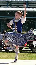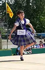 - The dance costume prescribed for females performing the Scottish National dances in competitions at Highland games gatherings. It consists of a dark bodice or elaborate waistcoat, decorative blouse, full tartan skirt and sometimes a petticoat and apron, or a tartan sash.