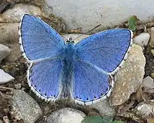- A bright blue butterfly, Polyommatus bellargus, of the family Lycaenidae.
