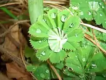 Alchemilla vulgaris leaves bearing water drops