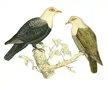 A depiction of Alectroenas sganzini (adult, left, and juvenile)