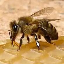 From Old High German bīa, from Proto-Germanic *bijō. Cognate with Dutch bij, West Frisian bij, English bee, Icelandic bý.
