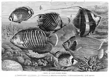 - (family): Amphichaetodon, Chaetodon, Chelmon, Chelmonops, Coradion, Forcipiger, Hemitaurichthys, Heniochus, Johnrandallia, Parachaetodon, Prognathodes, Roa - genera