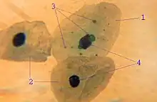 Epithelial cell (1) infected with Chlamydophila pneumoniae (3), formerly called Chlamydia pneumoniae