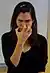 - Posture the dominant hand in the “claw 5” handshape within a few inches from the nose, dominant palm facing back.