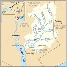 A map of the Croton river's drainage basin. There is also a village, called Croton-on-Hudson (or simply Croton) located along the river.