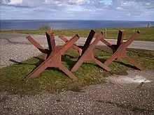 - (military) A static antitank and anti-landing craft obstacle, widely used during World War II, constructed from three mutually-perpendicular steel rails connected in the form of a tripod.