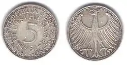 - Synonyms: Fünfmarkstück, 5-DM-Münze, (colloquial, slang) Heiermann