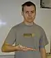 - Posture the dominant hand in the “flat B” handshape several inches in front from the trunk (in front of and just below the chest), dominant palm facing up.