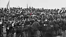 A crowd, watching Abraham Lincoln (shown with red arrow) as he gives the Gettysburg Address.