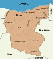 Inherited from Ottoman Turkish گیرهسون (Giresun), from Ancient Greek Κερασοῦς (Kerasoûs), from κερασός (kerasós, “cherry”) + -ουντ- (-ount-, “place”). May also derive from κέρας (kéras, “horn”) + -ουντ- (-ount-, “place”), alluding to the horn-shaped peninsula the city lies on, or both.[1]