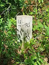 Grenzstein m (strong, genitive Grenzsteines or Grenzsteins, plural Grenzsteine)