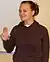 - Posture the dominant hand in a handshape where the thumb pad touches the pads of the index finger and middle finger, and the other fingers are curled to the palm (similar to the “Flat O” handshape) about half an arm’s length in front of the shoulder, palm facing forward.