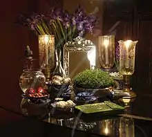 - A traditional table setting of Nowruz comprising several symbolic items.