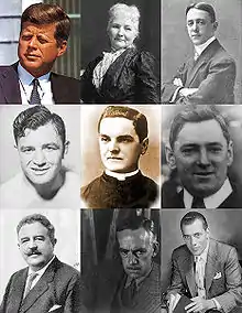 Notable Irish Americans (clockwise spiraling-in: John F. Kennedy, Mother Jones, George M. Cohan, James Michael Curley, Ed Sullivan, Eugene O'Neill, Victor Herbert, James Braddock and Michael J. McGivney
