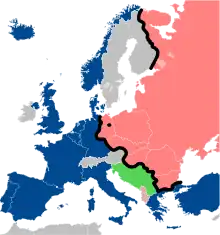 - (historical) The dividing line between Western Europe and the Soviet controlled regions, especially during the Cold War.