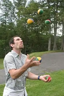 Jongleur m (strong, genitive Jongleures or Jongleurs, plural Jongleure, feminine Jongleurin)