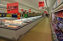 Kühlregal n (strong, genitive Kühlregales or Kühlregals, plural Kühlregale)