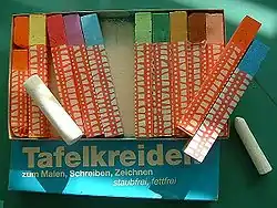- a chalk (a piece of chalk used for drawing and on a blackboard)