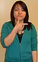 - Posture the dominant hand in the “L” handshape at the chin, thumb of the dominant hand pointing back.