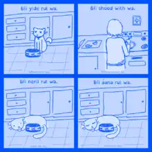 Laadana komiksaĵo (La kato malsatas / La homo okupiĝas / La kato atendas / La kato dormas)