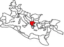 Macedonia (in red) on a map of the provinces of the Roman Empire circa AD 120.