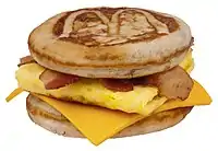 - A type of breakfast sandwich sold by the international fast food restaurant chain McDonald's that typically consists of fried bacon, a scrambled egg flap, and American cheese served on two small griddlecakes made with maple flavoring.